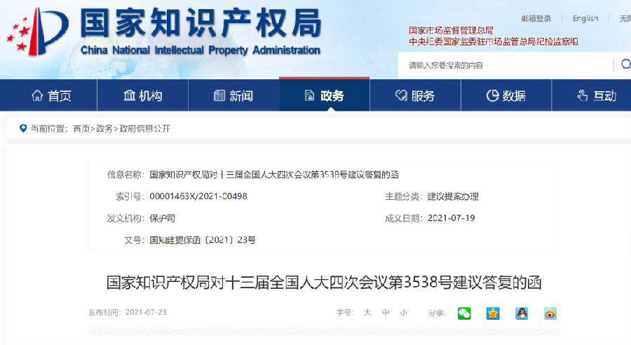 国家知识产权局对十三届全国人大四次会议第3538号建议答复的函