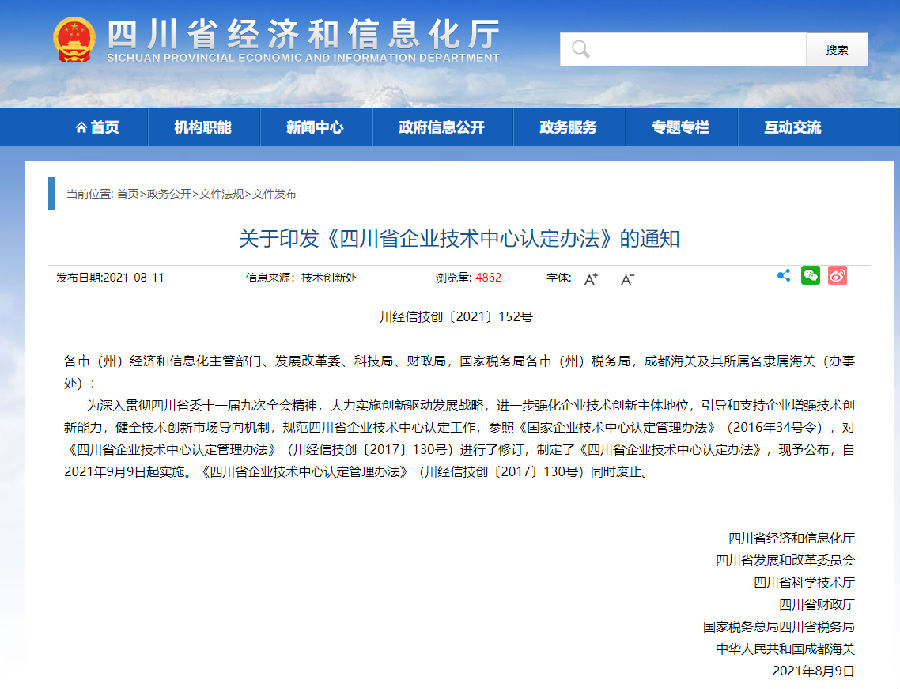 为深入贯彻四川省委十一届九次全会精神,大力实施创新驱动发展战略,进一步强化企业技术创新主体地位,引导和支持企业增强技术创新能力,健全技术创新市场导向机制,规范四川省企业技术中心认定工作,参照《国家企业技术中心认定管理办法》(2016年34号令),对《四川省企业技术中心认定管理办法》(川经信技创〔2017〕130号)进行了修订,制定了《四川省企业技术中心认定办法》,现予公布,自2021年9月9日起实施。《四川省企业技术中心认定管理办法》(川经信技创〔2017〕130号)同时废止。