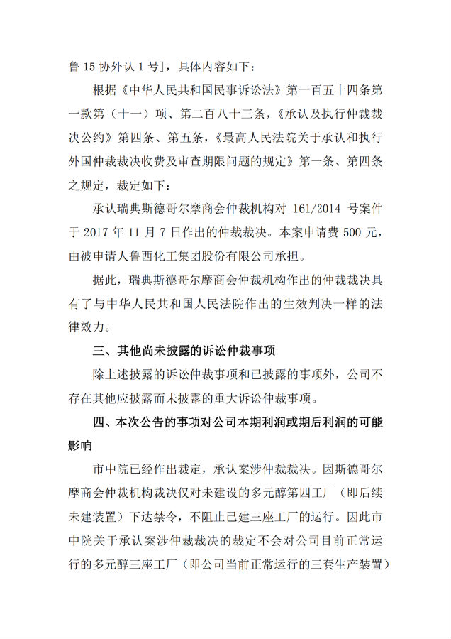 公司表示,仲裁事项仅对未建设的多元醇第四工厂(即后续未建装置)下达禁令,不阻止已建三座工厂的运行。因此聊城市中院关于承认案涉仲裁裁决的裁定不会对公司目前正常运行的多元醇三座工厂(即公司当前正常运行的三套生产装置)的生产销售产生影响。此外,由于涉案装置仅为多元醇,公司其他主营产品生产及项目建设不受影响。