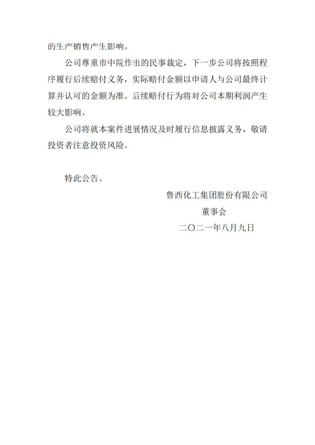 8月9日晚,鲁西化工发布公告,公司日前收到聊城市中院送达的《民事裁定书》,裁定承认瑞典斯德哥尔摩商会仲裁机构2017年11月7日就公司违反与庄信万丰戴维科技有限公司(简称“戴维”)、陶氏全球技术有限公司(简称“陶氏”)签署的《低压羰基合成技术不使用和保密协议》作出的仲裁裁决。
