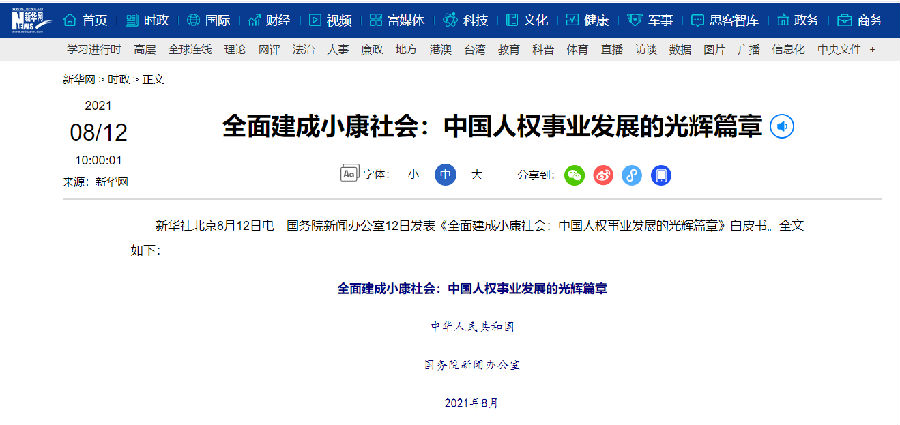 新华社北京8月12日电 国务院新闻办公室12日发表《全面建成小康社会:中国人权事业发展的光辉篇章》白皮书。全文如下:
