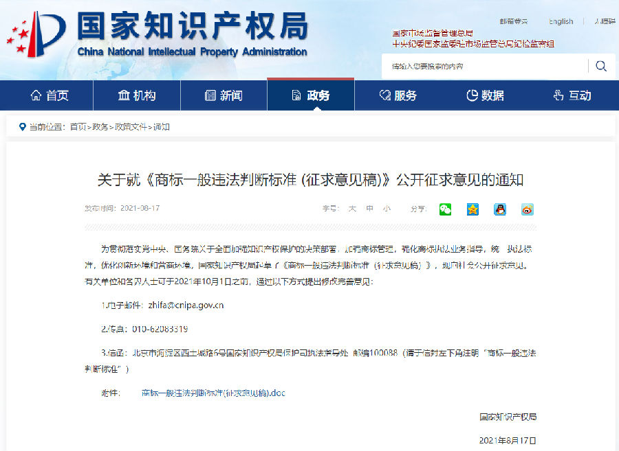 为贯彻落实党中央、国务院关于全面加强知识产权保护的决策部署,加强商标管理,强化商标执法业务指导,统一执法标准,优化创新环境和营商环境,国家知识产权局起草了《商标一般违法判断标准(征求意见稿)》,现向社会公开征求意见。有关单位和各界人士可于2021年10月1日之前,通过以下方式提出修改完善意见: