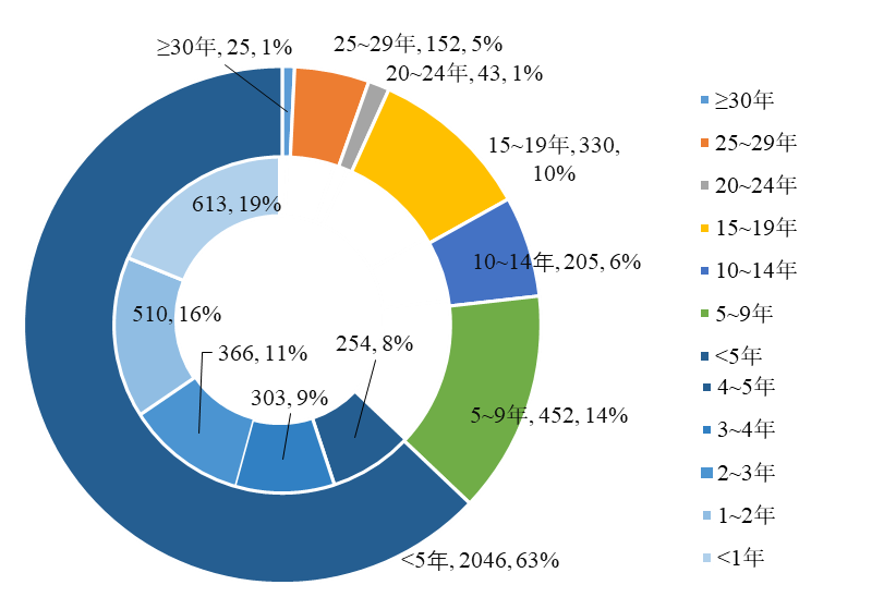 图2展示了专利代理机构成立时间分布情况。在3253家专利代理机构中,按专利代理机构的成立时间来看,成立20年以上的专利代理机构有220家,占全国专利代理机构总量的6.76%;成立15至19年(满15年不足20年,以下同此划分方式)的专利代理机构为330家,占比10.1%;成立10至14年的专利代理机构达205家,占比6.3%;成立5至9年的专利代理机构为452家,占比13.9%;成立3至5年的专利代理机构为557家,占比17.1%;成立时间在3年以内的专利代理机构为1489家,占比45.8%。
