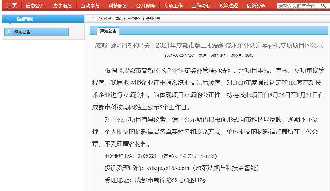 根据《成都市高新技术企业认定奖补管理办法》,经项目申报、审核、立项审议等程序,我局拟按照企业在申报系统提交先后顺序,对2020年度通过认定的102家高新技术企业进行立项奖补。为体现项目立项的公正性,特将该批项目自8月25日至8月31日在成都市科技局网站上公示5个工作日。