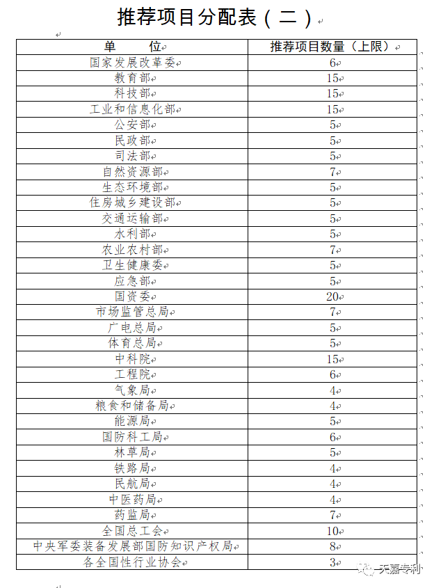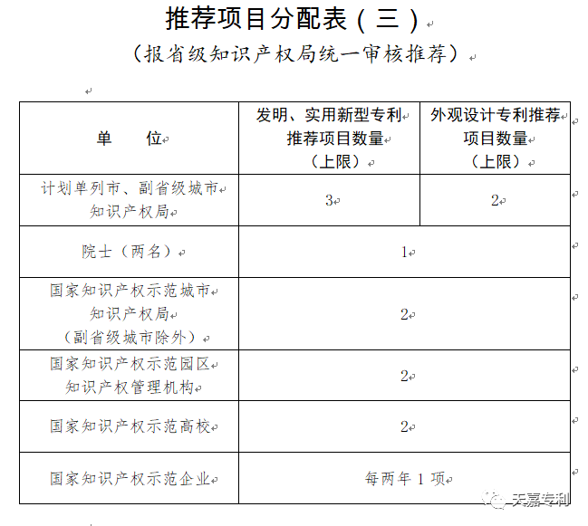 国家知识产权示范高校每年可自荐2个项目参评,国家知识产权示范企业每两年可自荐1个项目参评。