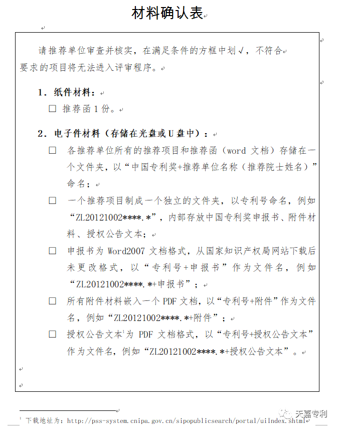 (2)项目资料1份(电子件),每个推荐项目包含:①中国专利奖申报书(WORD文档);②附件——如图片、照片、获奖证书、项目应用证明等材料扫描件,填写经济效益数据的,专利权人可以提供有资质的会计师事务所出具的参评专利经济效益专项审计报告等作为经济效益相关证明材料,所有附件应嵌入一个PDF文档,不超过20M;③专利授权公告文本。