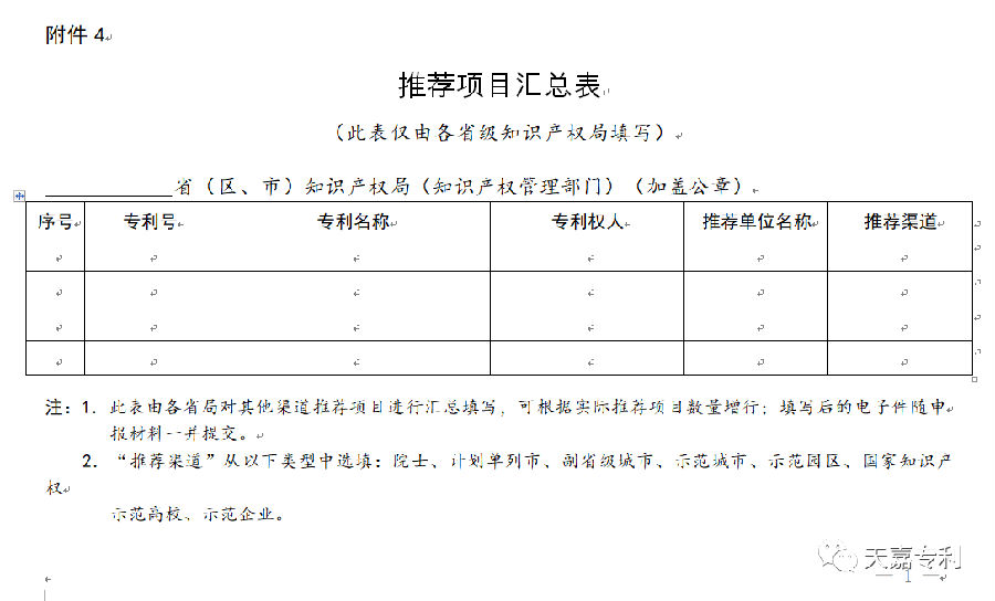 2.院士、计划单列市、副省级城市、知识产权示范城市和示范园区推荐的项目以及国家知识产权示范高校、示范企业自荐的项目,须经申报单位所在地省局审核和公示后,由省级知识产权局将相关申报材料汇总并填写推荐项目汇总表(附件4)统一报送。
