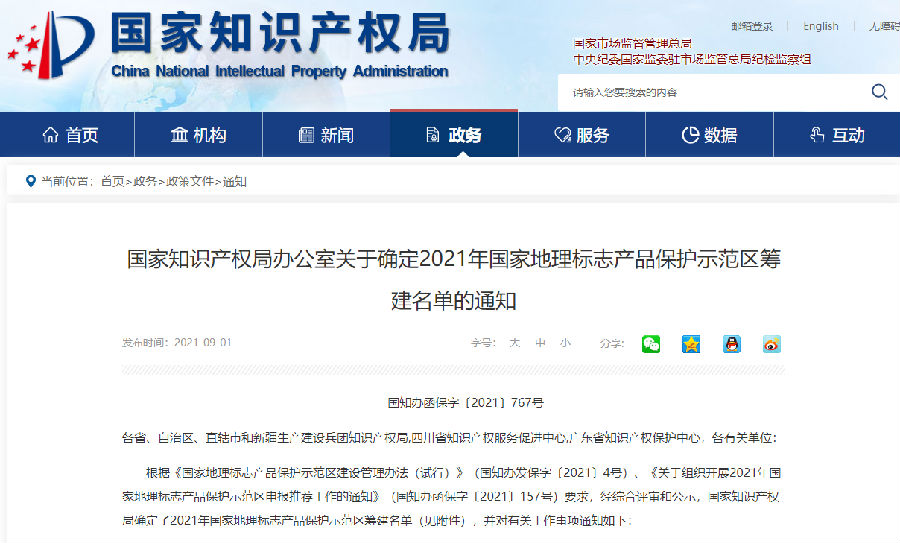 根据《国家地理标志产品保护示范区建设管理办法(试行)》(国知办发保字〔2021〕4号)、《关于组织开展2021年国家地理标志产品保护示范区申报推荐工作的通知》(国知办函保字〔2021〕157号)要求,经综合评审和公示,国家知识产权局确定了2021年国家地理标志产品保护示范区筹建名单(见附件),并对有关工作事项通知如下: