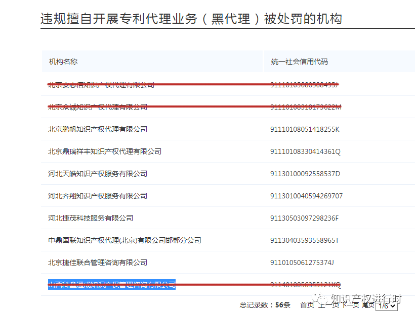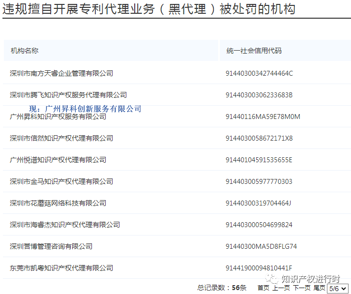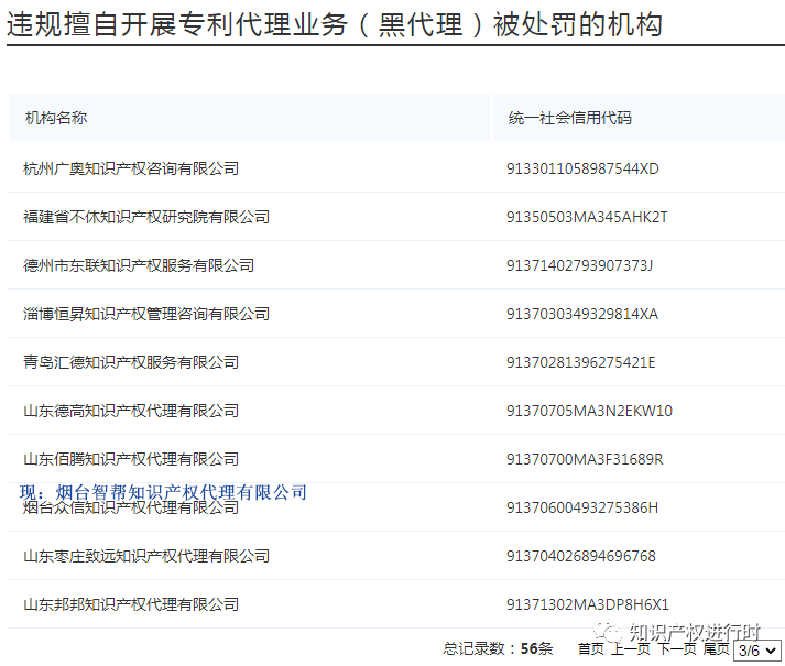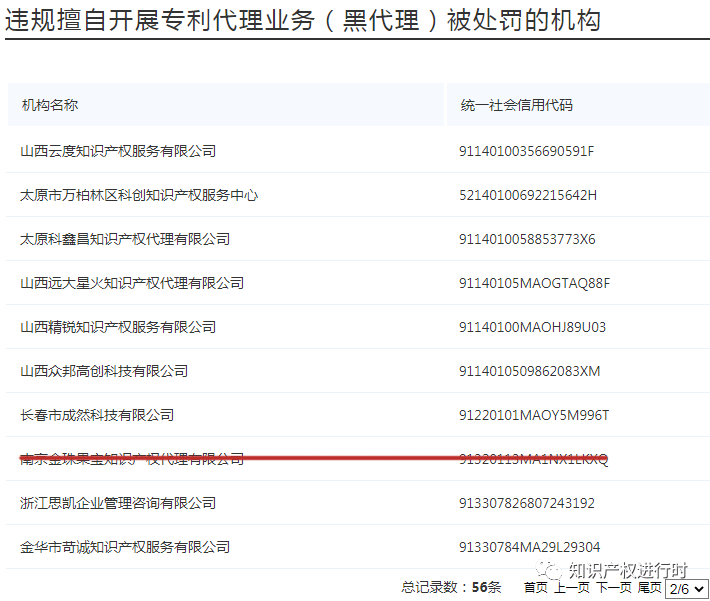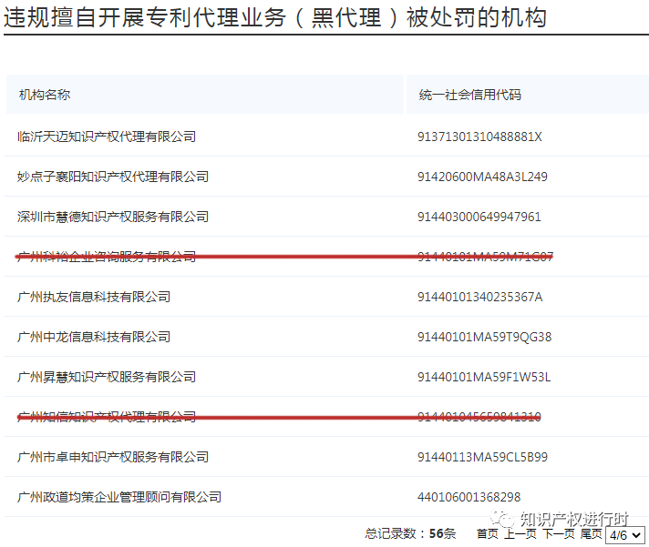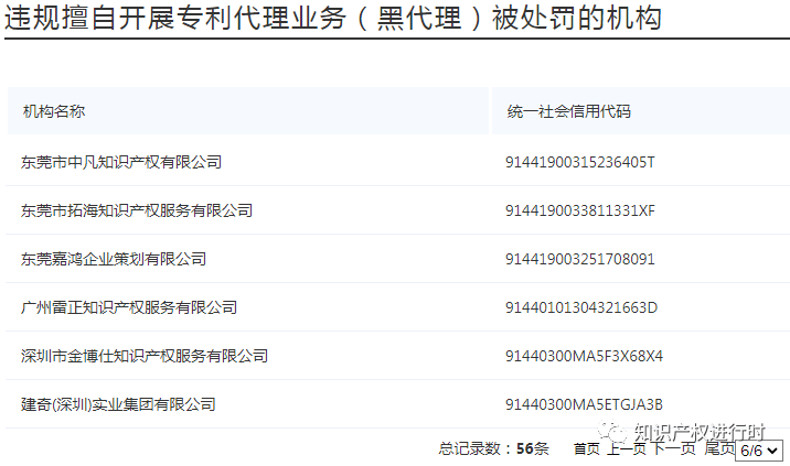 全国专利代理信息公示平台中的风险名单主要对存在风险的代理机构和代理人员进行公示;日前,对56家违规擅自开展专利代理业务被处罚的机构进行公示:
