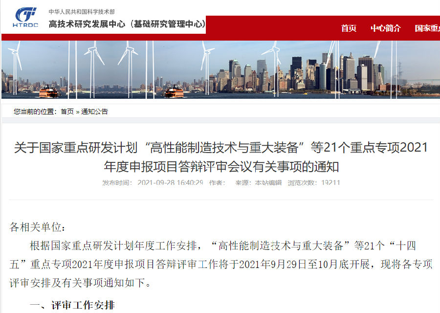 根据国家重点研发计划年度工作安排,“高性能制造技术与重大装备”等21个“十四五”重点专项2021年度申报项目答辩评审工作将于2021年9月29日至10月底开展,现将各专项评审安排及有关事项通知如下。
