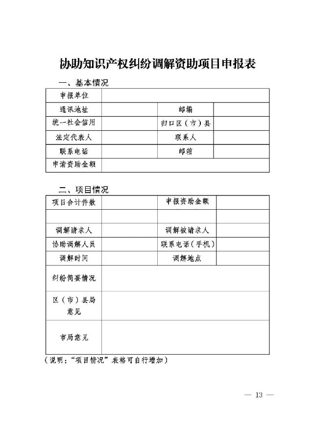(一)《协助知识产权纠纷调解资助项目申报书》