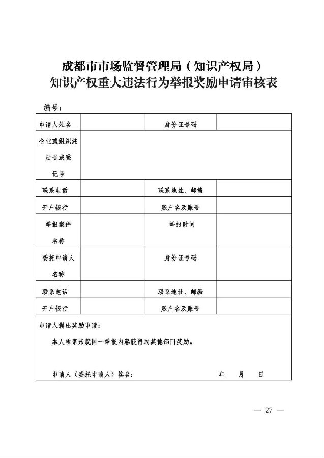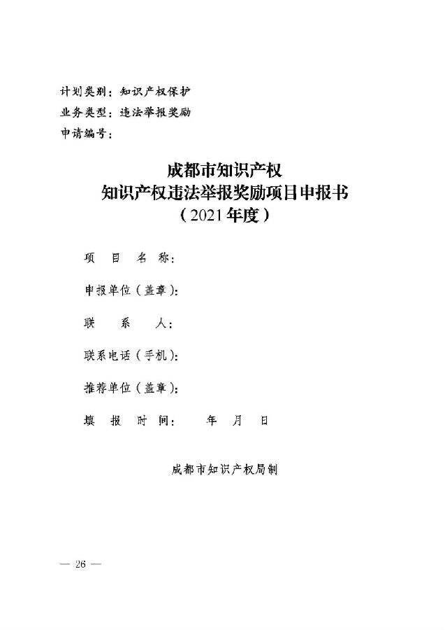 (一)《知识产权违法举报奖励项目申报书》;