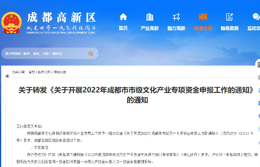 按照成都市文化体制改革和文化产业发展工作领导小组办公室《关于开展2022年成都市市级文产专项资金申报工作的通知》(成文改办〔2021〕9号)要求,成都高新区启动申报组织工作。