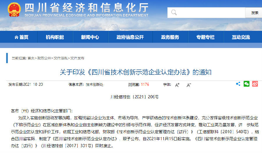 为深入实施创新驱动发展战略,加强我省以企业为主体、市场为导向、产学研结合的技术创新体系建设,充分发挥省级技术创新示范企业(下称示范企业)在区域创新体系和企业自主创新能力建设中的引领与示范作用,促进经济发展方式转变,推动工业高质量发展,进一步规范示范企业的认定和评价工作,依据工业和信息化部、财政部《技术创新示范企业认定管理办法(试行)》(工信部联科〔2010〕540号),结合四川省实际,制定了《四川省技术创新示范企业认定办法》,现予公布,自2021年11月15日起实施。《四川省技术创新示范企业认定管理办法(试行)》(川经信技创〔2017〕301号)同时废止。