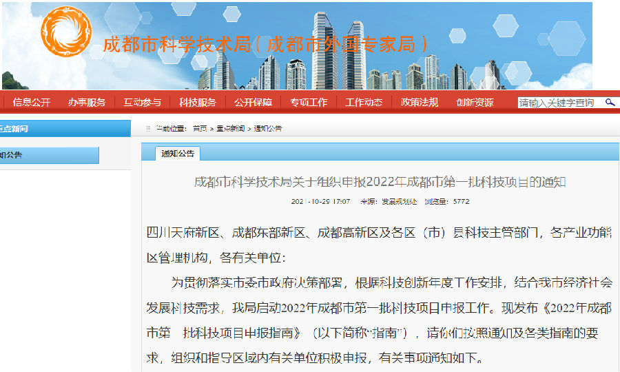 为贯彻落实市委市政府决策部署,根据科技创新年度工作安排,结合我市经济社会发展科技需求,我局启动2022年成都市第一批科技项目申报工作。现发布《2022年成都市第一批科技项目申报指南》(以下简称“指南”),请你们按照通知及各类指南的要求,组织和指导区域内有关单位积极申报,有关事项通知如下。