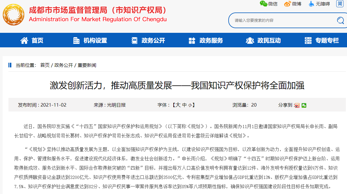 近日,国务院印发实施《“十四五”国家知识产权保护和运用规划》(以下简称《规划》)。国务院新闻办11月1日邀请国家知识产权局局长申长雨、副局长甘绍宁、战略规划司司长葛树、知识产权保护司司长张志成、知识产权运用促进司司长雷筱云详细解读《规划》。