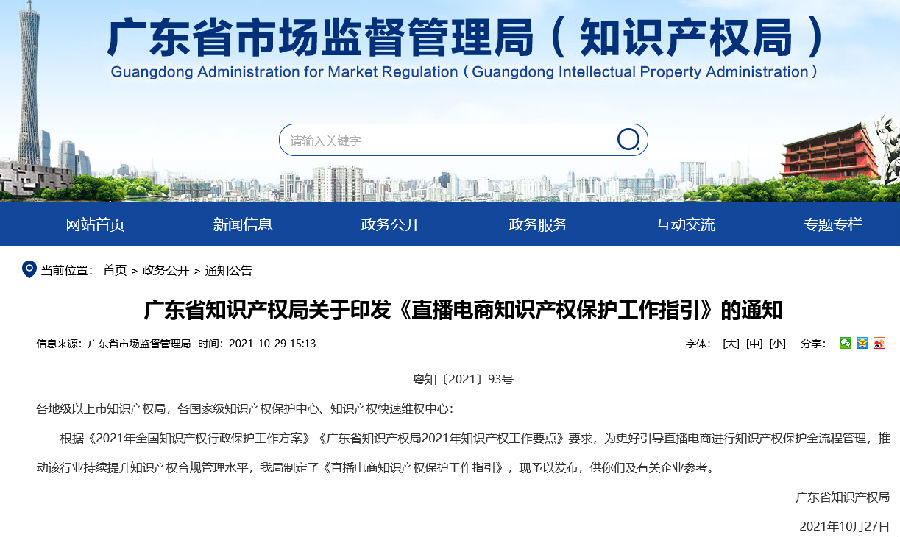 根据《2021年全国知识产权行政保护工作方案》《广东省知识产权局2021年知识产权工作要点》要求,为更好引导直播电商进行知识产权保护全流程管理,推动该行业持续提升知识产权合规管理水平,我局制定了《直播电商知识产权保护工作指引》,现予以发布,供你们及有关企业参考。
