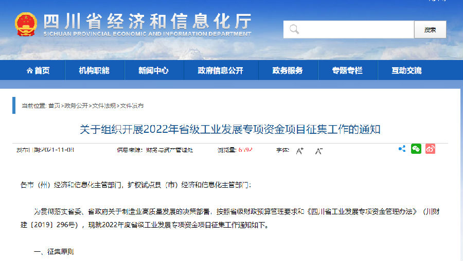 为贯彻落实省委、省政府关于制造业高质量发展的决策部署,按照省级财政预算管理要求和《四川省工业发展专项资金管理办法》(川财建〔2019〕296号),现就2022年度省级工业发展专项资金项目征集工作通知如下。