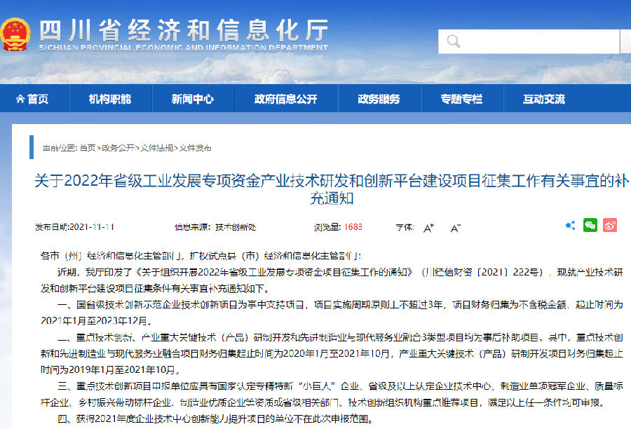 近期,我厅印发了《关于组织开展2022年省级工业发展专项资金项目征集工作的通知》(川经信财资〔2021〕222号),现就产业技术研发和创新平台建设项目征集条件有关事宜补充通知如下。