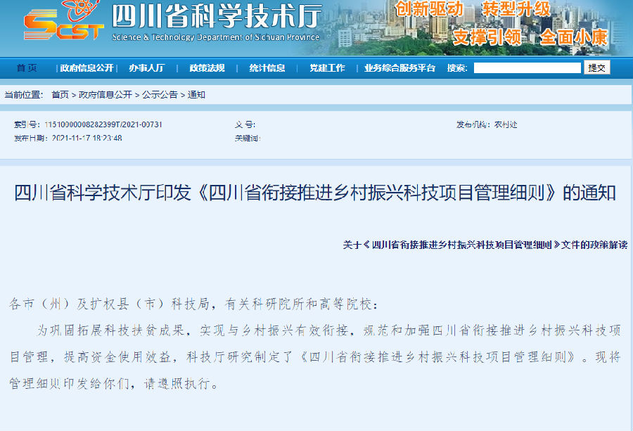 为巩固拓展科技扶贫成果,实现与乡村振兴有效衔接,规范和加强四川省衔接推进乡村振兴科技项目管理,提高资金使用效益,科技厅研究制定了《四川省衔接推进乡村振兴科技项目管理细则》。现将管理细则印发给你们,请遵照执行。