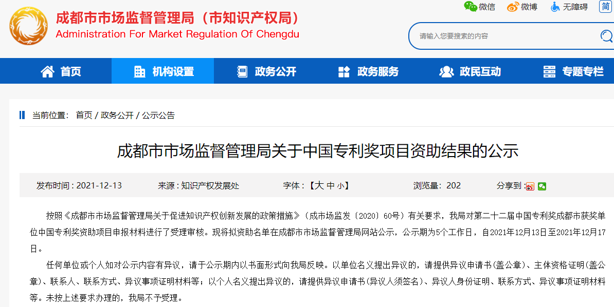 按照《成都市市场监督管理局关于促进知识产权创新发展的政策措施》(成市场监发〔2020〕60号)有关要求,我局对第二十二届中国专利奖成都市获奖单位中国专利奖资助项目申报材料进行了受理审核。现将拟资助名单在成都市市场监督管理局网站公示,公示期为5个工作日,自2021年12月13日至2021年12月17日。