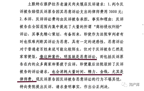 土默特右旗萨拉齐老潼关肉夹馍店称,反诉被告在全国范围内集中提起了大量的所谓“商标侵权纠纷”诉讼,其事先精心策划、有备而来,即使作为法院审判者有时也很难判断其诉讼为恶意,具有一定的迷惑性。
