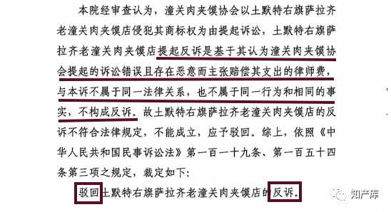 起因,潼关肉夹馍协会诉土默特右旗萨拉齐老潼关肉夹馍店侵害商标权纠纷一案,在该案立案审理过程中,土默特右旗萨拉齐老潼关肉夹馍店提出反诉。