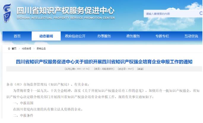 为贯彻省委十一届九次、十次全会精神,落实《关于开展知识产权强企培育工作的意见》,加快培育一批知识产权强企,省知识产权中心决定联合相关部门开展四川省知识产权强企培育企业申报工作,现将有关事宜通知如下: