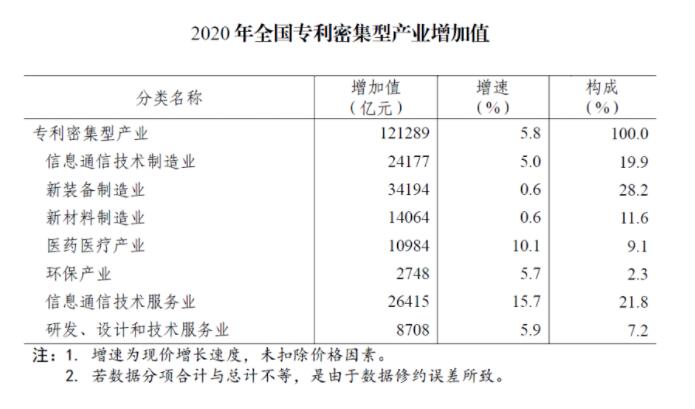 经核算,2020年全国专利密集型产业增加值为121289亿元,比上年增长5.8%(未扣除价格因素,下同),比同期国内生产总值(GDP)现价增速高3.1个百分点;占GDP的比重为11.97%,比上年提高0.35个百分点。