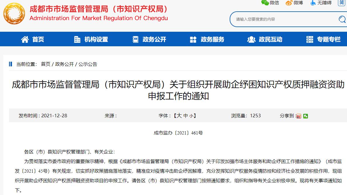 为贯彻落实市委市政府的重要指示精神,根据《成都市市场监督管理局(市知识产权局)关于印发加强市场主体服务和助企纾困工作措施的通知》(成市监发〔2021〕45号)有关规定,切实抓好政策措施落地落实,精准应对疫情冲击助企纾困解难,充分发挥知识产权服务疫情防控和经济社会发展的积极作用,现组织开展助企纾困知识产权质押融资资助项目的申报工作。请各区(市)县知识产权管理部门按照通知要求,组织和指导有关企业积极申报。现将有关事项通知如下。