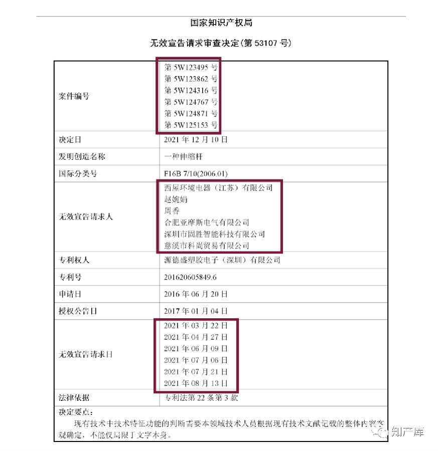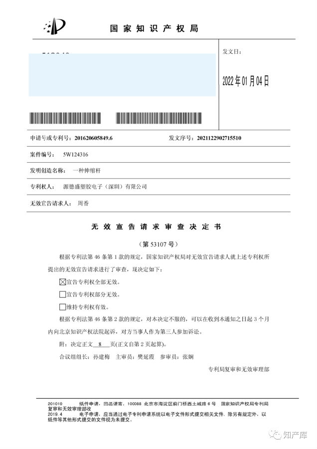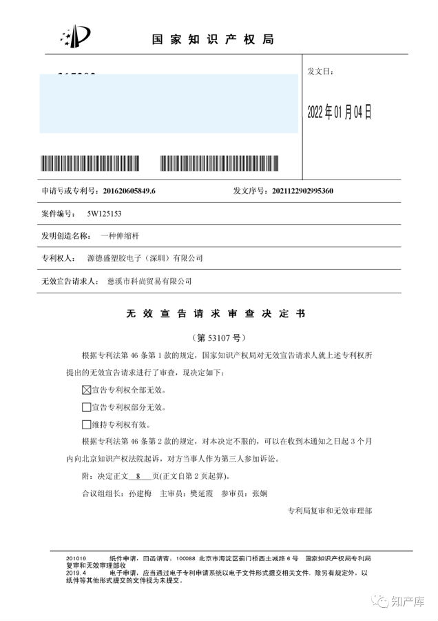2022年1月4日,国知局公布了一种伸缩杆专利无效宣告决定书,一口气就六份: