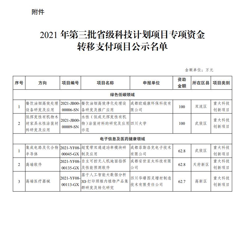 根据财政厅、科技厅《关于下达2021年第三批省级科技计划项目专项资金预算的通知》(川财教〔2021〕171号)及转移支付项目有关要求,经项目申报、评审、立项审议等程序,我局拟对5个重大科技创新项目立项资助。为体现项目立项的公正性,现将该批项目自2022年1月26日至2022月1月30日在成都市科技局网站上公示5个工作日。