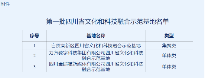 为推进文化和科技深度融合,全面提升文化科技创新能力,按照《关于推动文化和科技深度融合的实施意见》(川科高〔2020〕22号)、《四川省文化和科技融合示范基地认定管理暂行办法》(川科高〔2021〕20号)有关要求和工作安排,科技厅、省委宣传部启动了第一批四川省文化和科技融合示范基地认定工作。经综合评议,决定认定1家聚集类基地,2家单体类基地为第一批四川省文化和科技融合示范基地(名单见附件)。