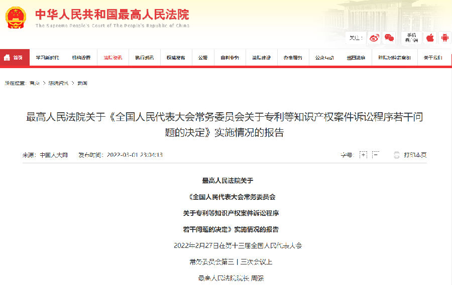 根据党中央决策部署和《全国人民代表大会常务委员会关于专利等知识产权案件诉讼程序若干问题的决定》(以下简称《决定》),设立最高人民法院知识产权法庭,建立国家层面知识产权案件上诉审理机制。按照本次会议安排,我代表最高人民法院报告三年来《决定》实施情况,请审议。