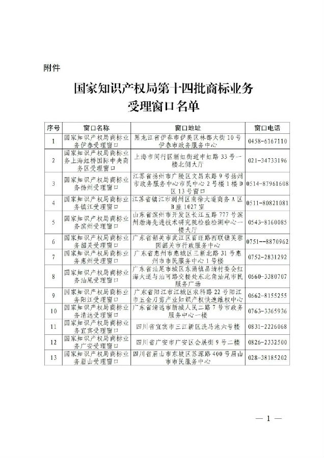 附件:国家知识产权局第十四批商标业务受理窗口名单.pdf