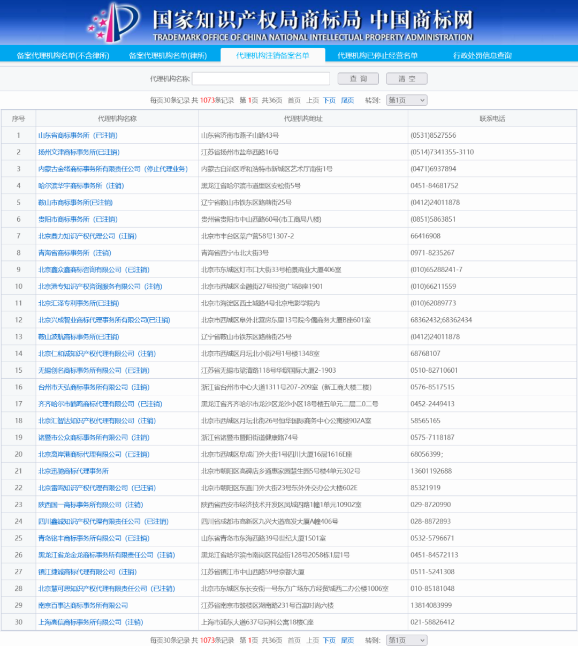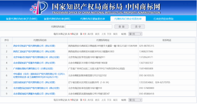 据中国商标网查询显示,目前已有9家代理机构停止经营。