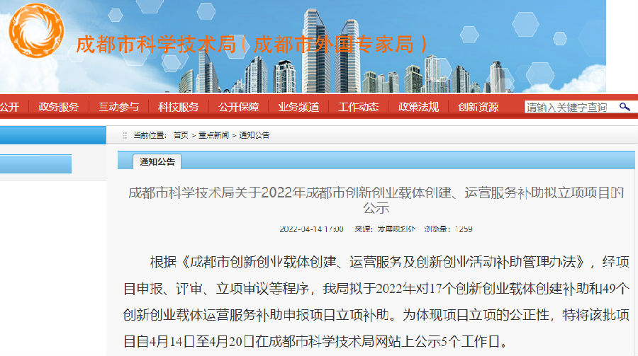 成都市科技技术局关于2022年成都市创新创业载体创建、运营服务补助拟立项项目的公示