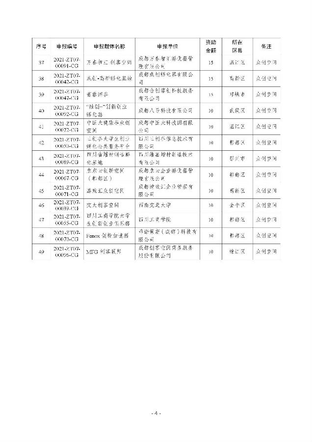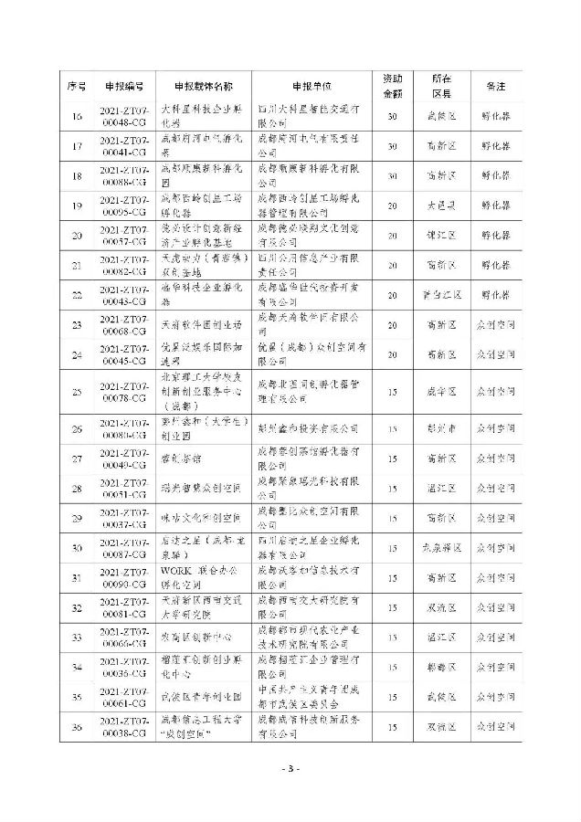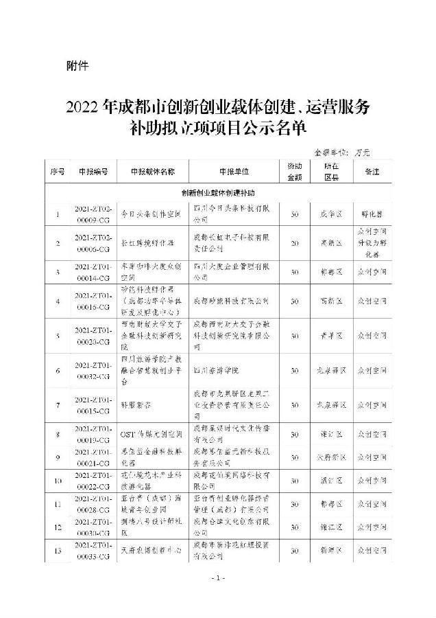 附件:2022年成都市创新创业载体创建、运营服务补助拟立项项目公示名单
