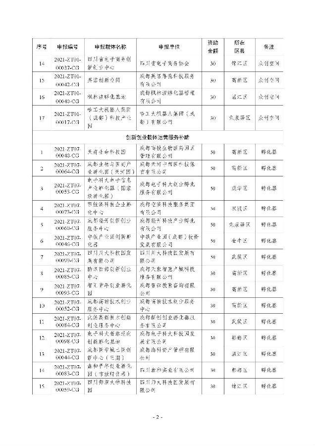 2022年成都市创新创业载体创建、运营服务补助拟立项项目公示名单