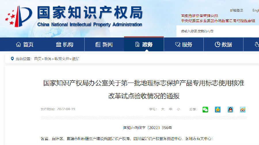 根据《国家知识产权局办公室关于开展地理标志保护产品专用标志使用核准改革试点验收工作的通知》(国知办函保字〔2022〕45号),国家知识产权局组织对第一批试点工作任务完成情况以及取得的成效进行验收。经综合评审,12个试点地方均通过验收,其中综合得分排前五名的依次是安徽省、江苏省、陕西省、贵州省和四川省,验收结果评定为优秀。
