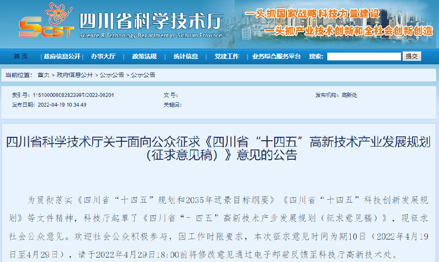 为贯彻落实《四川省“十四五”规划和2035年远景目标纲要》《四川省“十四五”科技创新发展规划》等文件精神,科技厅起草了《四川省“十四五”高新技术产业发展规划(征求意见稿)》,现征求社会公众意见。欢迎社会公众积极参与,因工作时限要求,本次征求意见时间为期10日(2022年4月19日至4月29日),请于2022年4月29日18:00前将修改意见通过电子邮箱反馈至科技厅高新技术处。