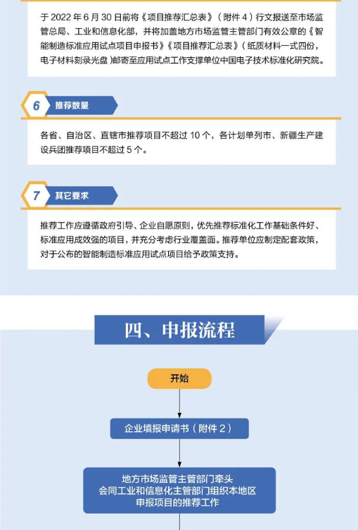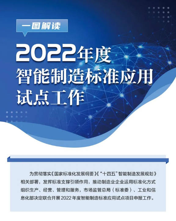 为贯彻落实《国家标准化发展纲要》《“十四五”智能制造发展规划》相关部署,发挥标准支撑引领作用,推动制造业企业运用标准化方式组织生产、经营、管理和服务,市场监管总局(标准委)、工业和信息化部决定联合开展2022年度智能制造标准应用试点项目申报工作,并就有关事项通知如下:
