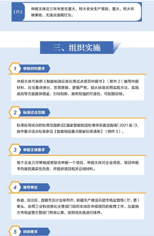 (一)加强组织管理。市场监管总局、工业和信息化部做好智能制造标准应用试点工作的顶层规划,推进试点项目的下达、检查和考核验收。各地市场监管、工业和信息化主管部门做好智能制造标准应用试点工作的组织申报、监督检查和定期考核。