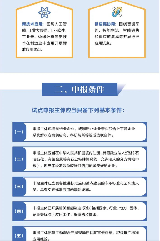 申报主体围绕以下重点方向,开展智能制造标准应用试点工作。智能制造标准应用试点周期为2年。