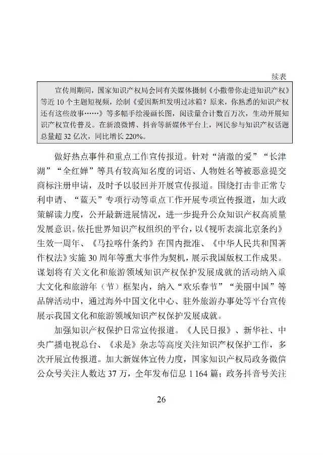 文化建设方面,全力做好学习贯彻习近平总书记关于面加强知识产权保护工作重要指示、论述和党中央国务院决策部署的宣传报道,把握新形势新任务,多角度讲好中国知识产权故事,展示文明大国、负责任大国形象。2021年,针对知识产权保护重大专题宣传报道总量超10万篇次,新媒体平台相关话题参与人次近40亿。
