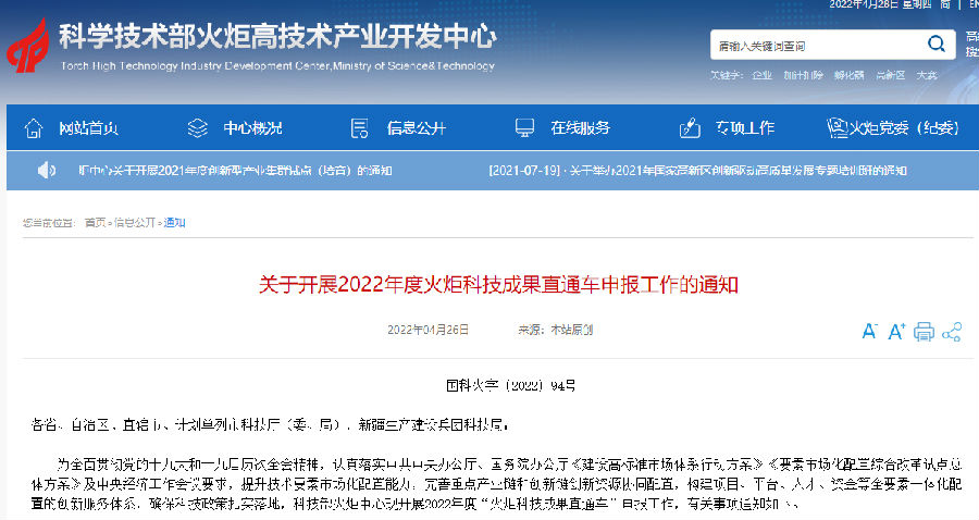关于开展2022年度火炬科技成果直通车申报工作的通知