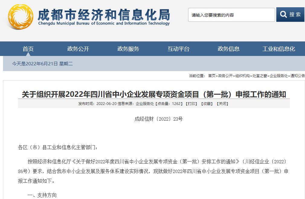 按照经济和信息化厅《关于做好2022年度四川省中小企业发展专项资金(第一批)安排工作的通知》(川经信企业〔2022〕86号)要求,结合我市中小企业发展及服务体系建设实际情况,现就做好2022年四川省中小企业发展专项资金项目(第一批)申报工作通知如下。
