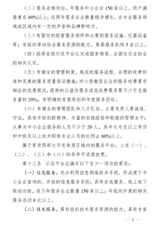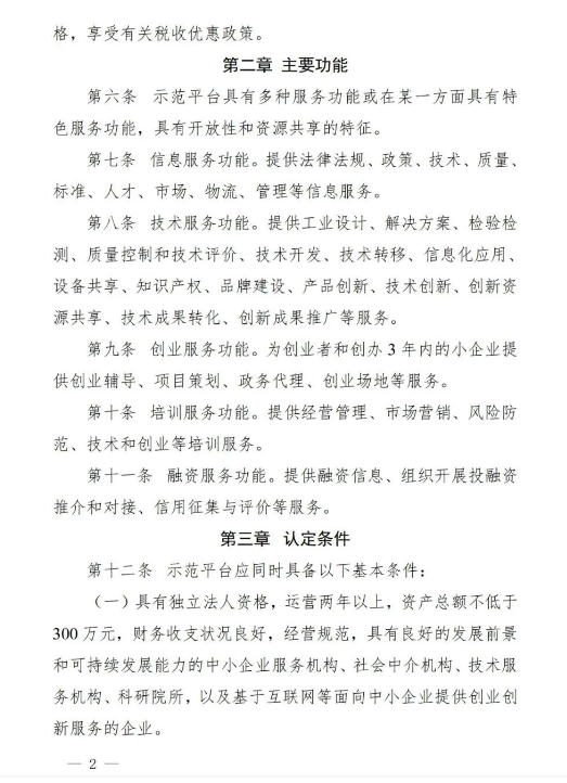 2.申请信息类、培训类示范平台年服务企业达到1000家以上的,申请技术类、创业类、融资类示范平台年服务企业达到500家以上的。
