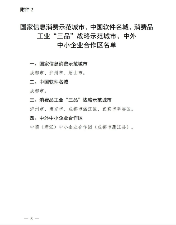 2.国家信息消费示范城市、中国软件名城、消费品工业“三品”战略示范城市、中外中小企业合作区名单