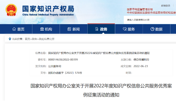 国家知识产权局办公室关于开展2022年度知识产权信息公共服务优秀案例征集活动的通知